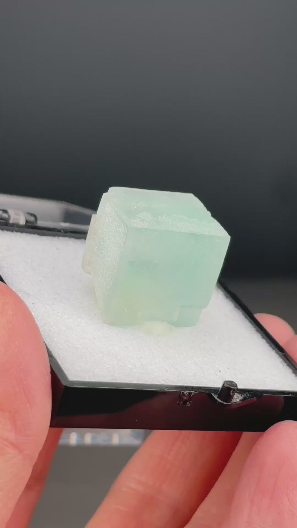 A pale green translucent fluorite cube encased in an acrylic box.