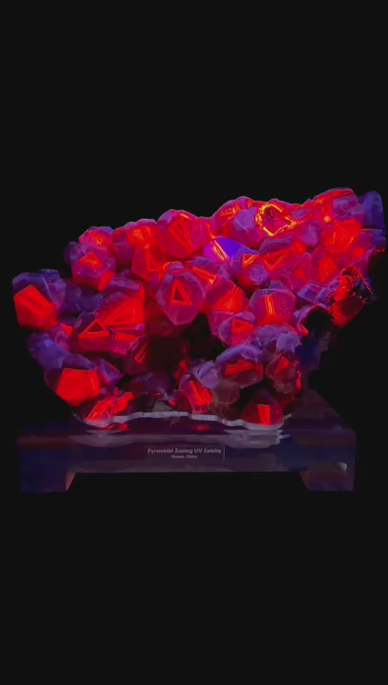 Mineral Angel’s exclusive material! Discovered 20 years ago in China, this calcite shows natural fluorescence due to manganese impurities. We conducted an in-depth study and made a breakthrough discovery: using our specialized physical adjustment technique, the tips of the crystal are partially deconstructed to reveal its internal UV structure in striking funky geometric shapes.